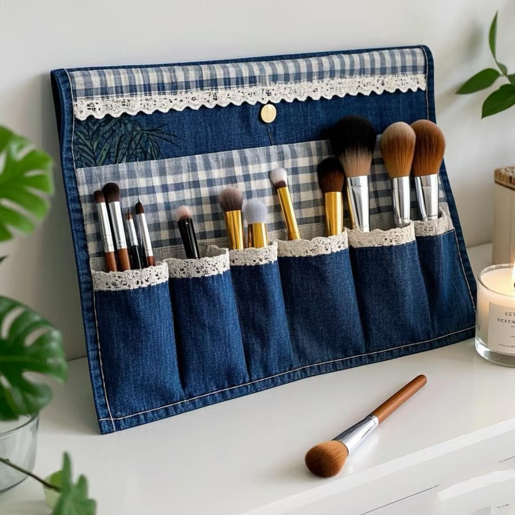 Denim Makeup Brush Organizer with 6 Pockets